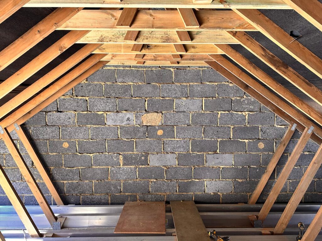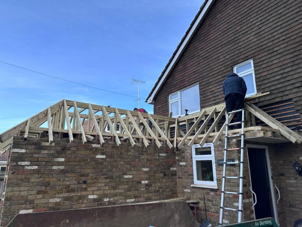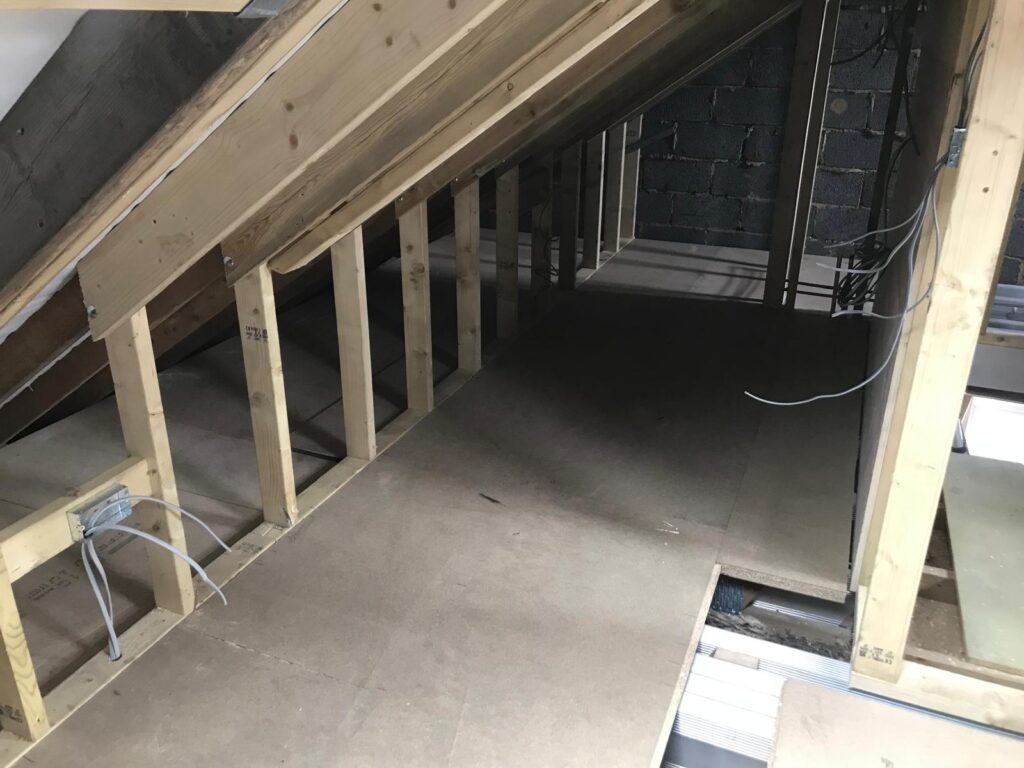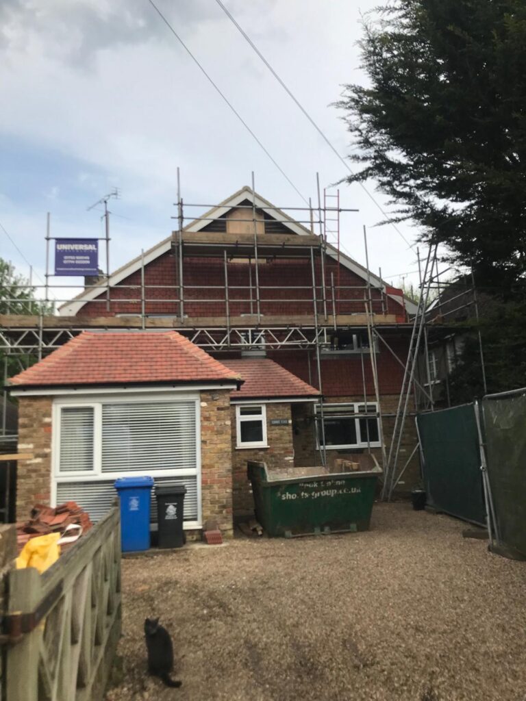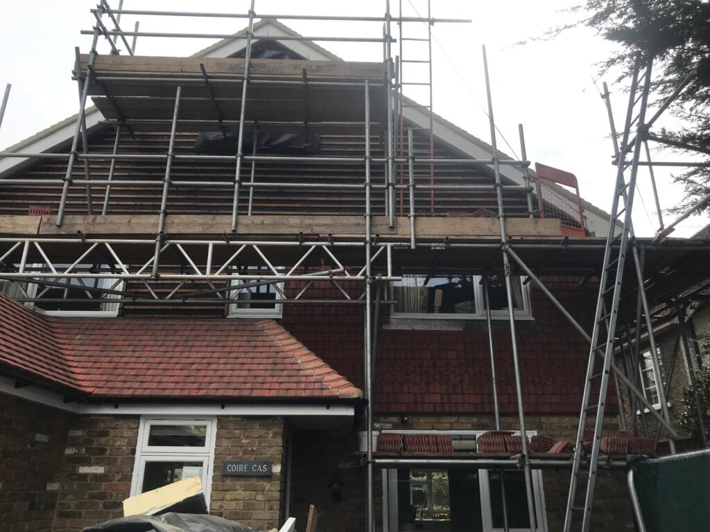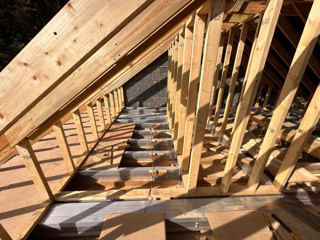 Extend the existing loft space, removing the existing roof trusses and installing a tele beam system to support the roof structure and turn the loft space into an extra bedroom and ensuite bathroom. Remove all existing roof tiles and install new, whilst integrating solar panels to both roof pitches. Remove the existing flat roof over the previously extended garage and install a new cut pitched roof for added storage.