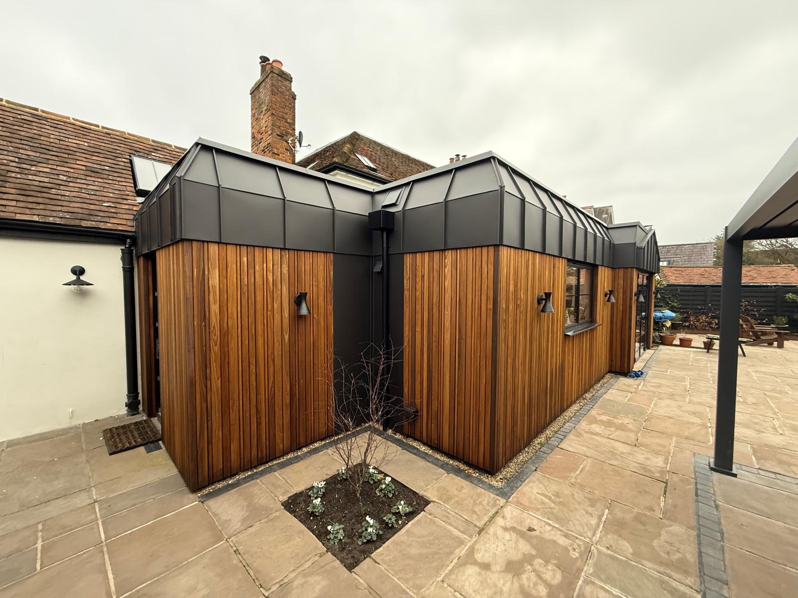 "The open-plan kitchen, living, and utility space is not only beautifully designed but incredibly functional. The timber cladding and zinc roof create a striking contrast that feels both modern and warm, perfectly complementing the original brickwork."